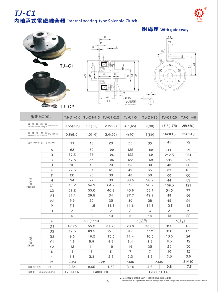 東莞天機(jī)傳動(臺灣天機(jī)牌)電磁離合器生產(chǎn)廠家制造銷售內(nèi)軸承式電磁離合器(掛鉤式電磁離合器),對應(yīng)的型號是TJ-C2,電磁離合器線圈通電時(shí),在電磁力的作用下,將主動轉(zhuǎn)子與從動轉(zhuǎn)子連接在一起,主動端與從動端同時(shí)轉(zhuǎn)動,電磁離合器處于閉合的狀態(tài)。