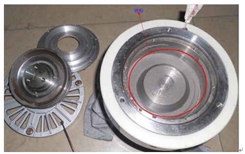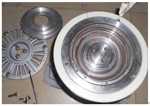 2、 然后用準備好的工具將磁粉制動器端蓋的固定螺栓以及定子固定螺栓擰開,將端蓋取出后,再將擋蓋的幾個固定螺栓擰開并取下擋蓋,然后再取出定子。取出定子后,看到就是轉子,里面放置就是磁粉(微顆粒狀)。